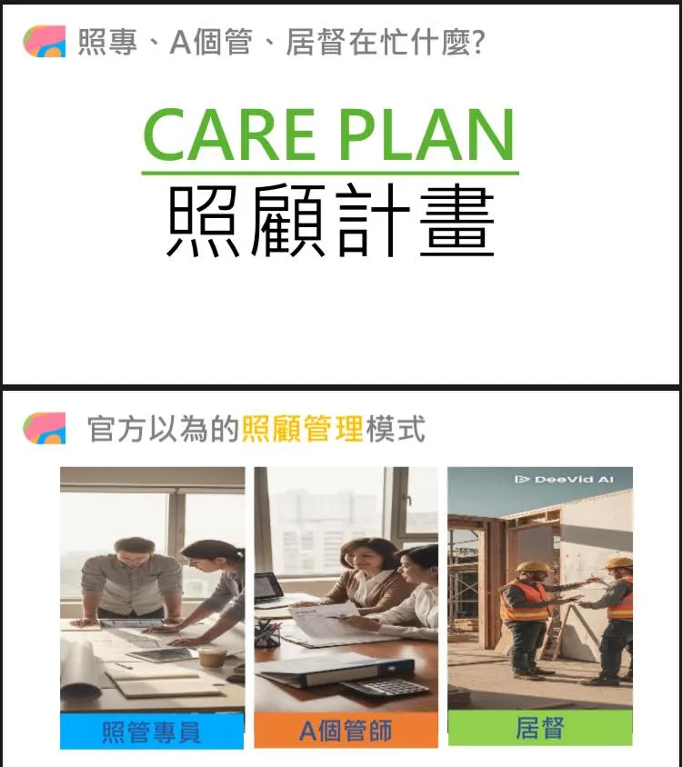 3.個管師,依據使用者失能等級,負責照顧計劃討論與安排。有些縣市會再初次訪評時,共同聯合訪視,也有些是分開訪視。